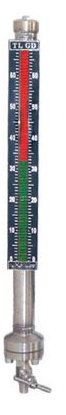 和被測容器形成連通器,保證被測量容器與測量管體間的液位相等。當液位計測量管中的浮子隨被測液位變化時,浮子中的磁性體與顯示條上顯示色標中的磁性體作用,使其翻轉(zhuǎn),紅色表示有液,白色表示無液,以達到就地準確顯示液位的目的。